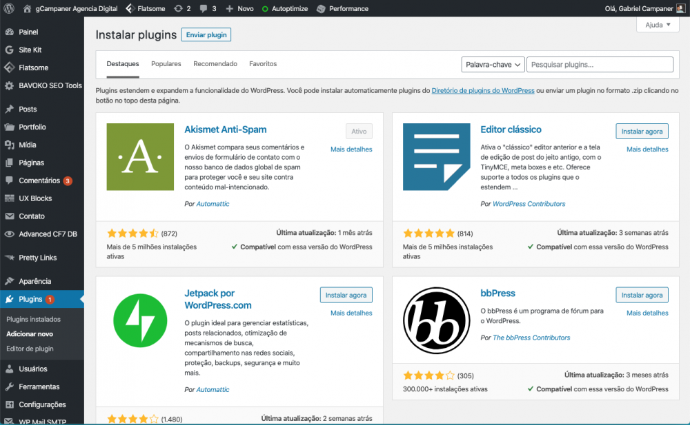 É provável que você já veja o plugin Akismet Anti-Spam em destaque logo na entrada, por que ele é o mais famoso para isso mesmo! se não estiver aparecendo na sua tela principal, use o campo de busca no canto direito (Pesquisar plugins) e digite akismet que encontrará este plugin.