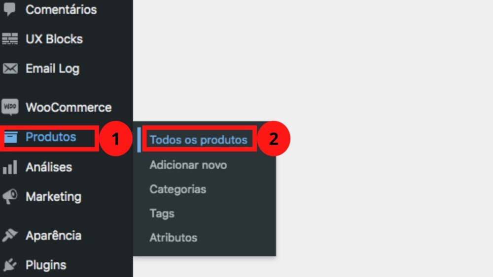 Primeiro passo é entrar no admin da sua loja e no menu lateral que fica à esquerda, procurar por PRODUTOS> TODOS OS PRODUTOS.