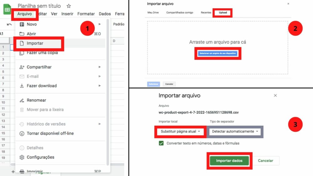 Com o arquivo da planilha, agora você consegue abrir onde preferir e editar. Aconselhamos abrir no Drive do Google, fica mais fácil até de compartilhar com outros membros da equipe. Veja como: No Google Drive, abra uma planilha nova. Em ARQUIVOS> IMPORTAR> SELECIONE O ARQUIVO> UPLOAD> SUBSTITUIR PÁGINA ATUAL> DETECTAR AUTOMATICAMENTE> IMPORTAR DADOS