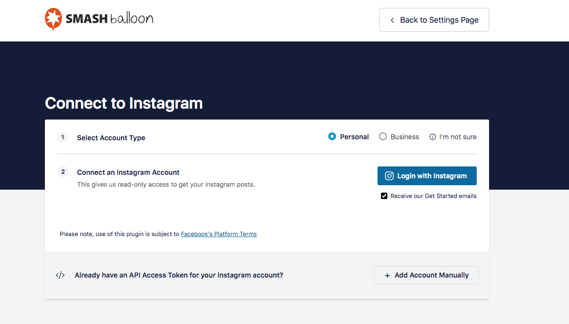 Ao fazer clicar em “Add Source” no passo anterior você será redirecionado para este novo passo onde deverá selecionar o tipo de conta do instagram Personal ou Business.