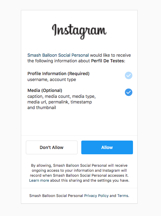 Se tudo ocorrer bem, você verá sua tela parecida com a imagem abaixo, a sua conta do instagram irá aparecer na caixinha como na imagem abaixo.
