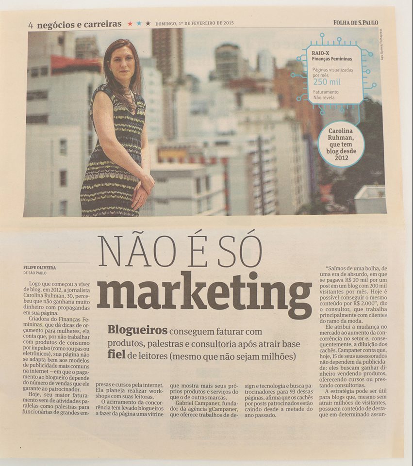 gCampaner em uma matéria sobre blogueiros que conseguem faturar com produtos, palestras e consultoria após atraírem leitores fies na Folha de São Paulo!